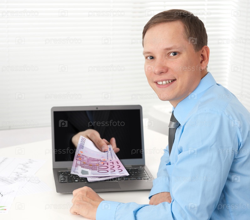 Человеческая рука с деньгами выходит из экрана ноутбука