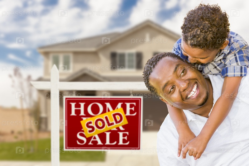 Отец и сын перед домом со знаком о продаже