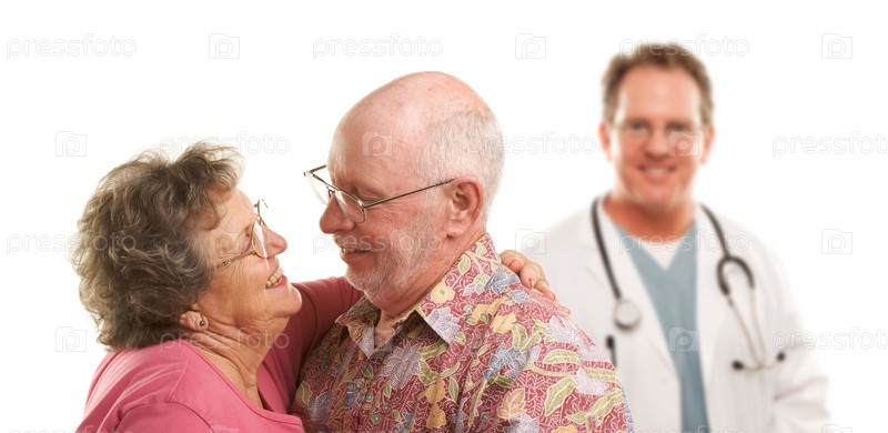 Пожилая пара и врач на заднем плане