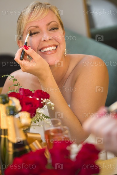 Блондинка делает макияж перед зеркалом с шампанским и розами