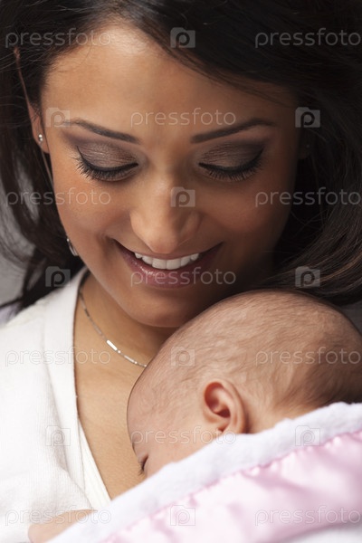 Привлекательная этническая женщина с новорожденным ребенком