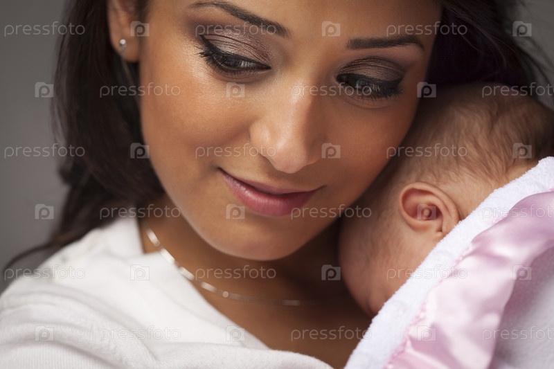 Привлекательная этническая женщина с новорожденным ребенком