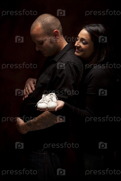 Беременный мужчина и женщина с белыми пинеткамми на черном фоне