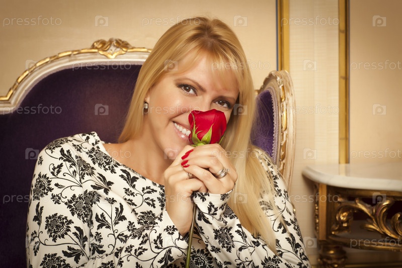 Улыбающаяся женщина нюхает красную розу, сидя в кресле