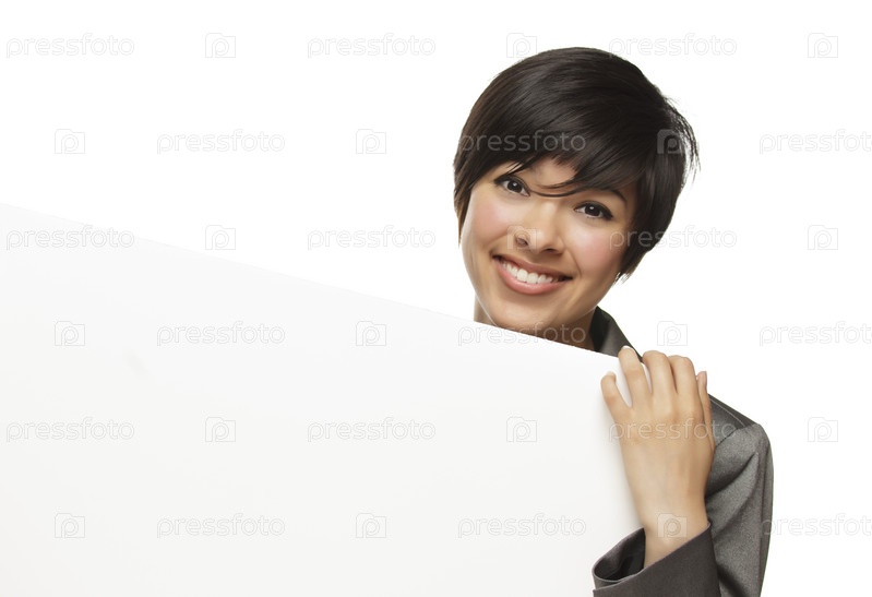 Привлекательная девушка смешанного происхождения с плакатом на белом фоне