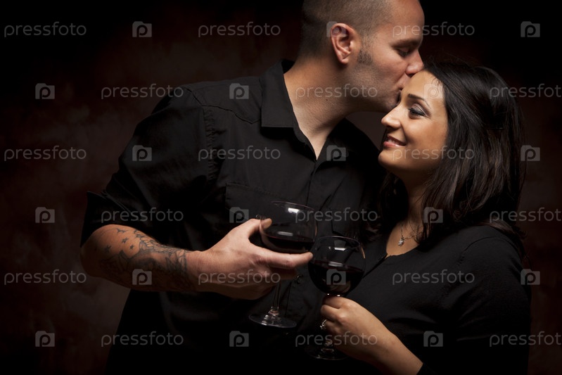 Счастливая пара с бокалами заигрывает друг с другом