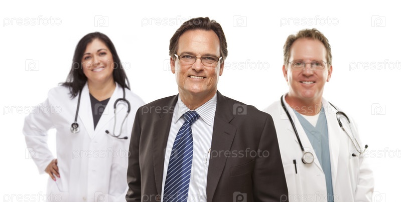 Бизнесмен с медицинским персоналом на заднем плане