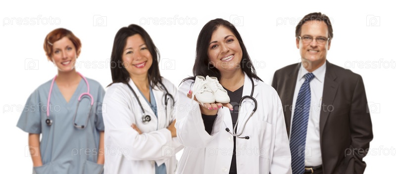 Латиноамериканская женщина-врач с пинетками и персонал на заднем плане