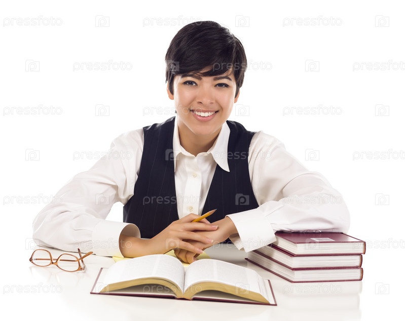 Улыбающаяся студентка с книгами, изолированная на белом фоне