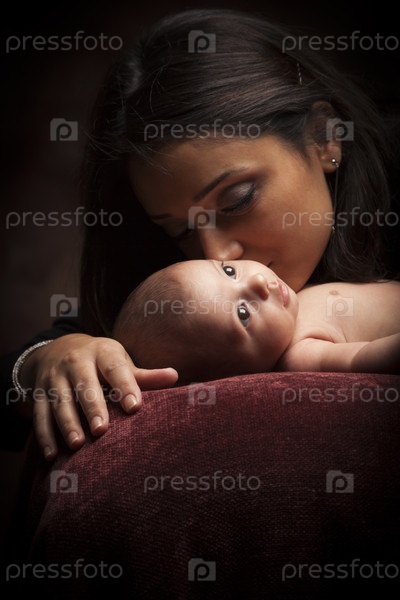 Привлекательная этническая женщина с новорожденным ребенком