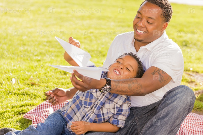Отец и сын играют с бумажными самолетиками
