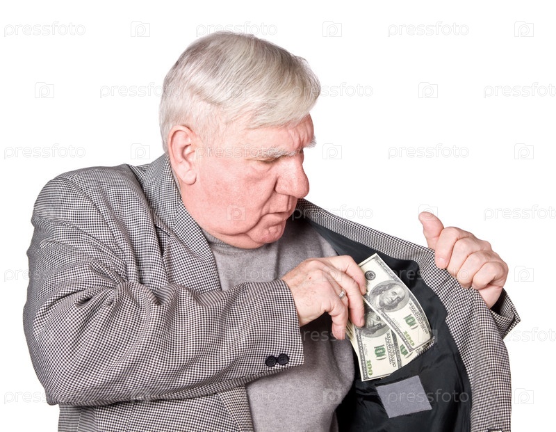 Пожилой человек кладет деньги во внутренний карман пиджака, изолированный на белом фоне