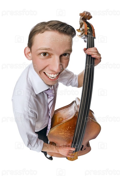 Музыкант с контрабасом, изолированный на белом фоне