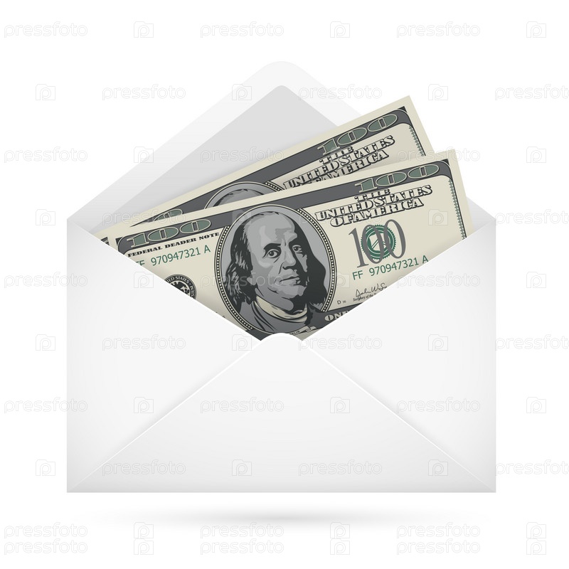 Открытый конверт с долларами на белом фоне