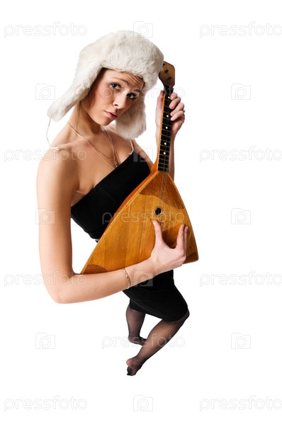 Русская девушка с балалайкой на белом фоне