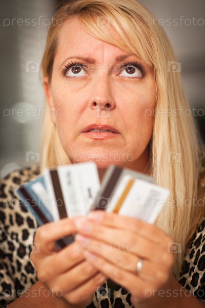Расстроенная женщина смотрит на многочисленные кредитные карты