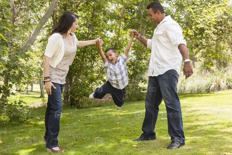 Латиноамериканская мать и отец раскачивают сына в парке