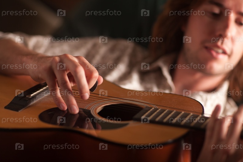 Молодой музыкант играет на акустической гитаре