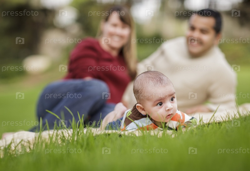 Счастливый мальчик смешанного происхождения и родители отдыхают в парке
