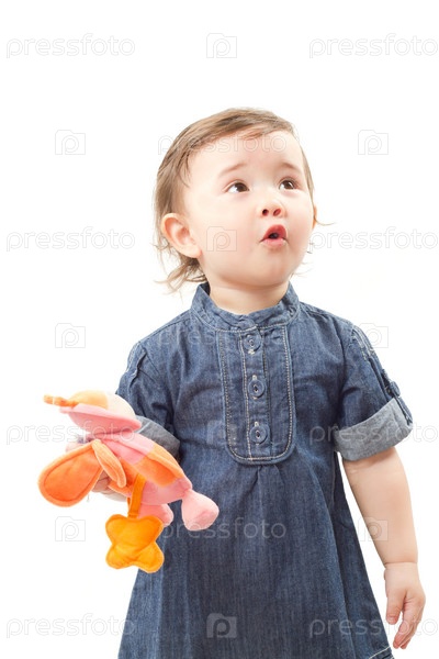 Очаровательная маленькая девочка с игрушкой, изолированная на белом фоне