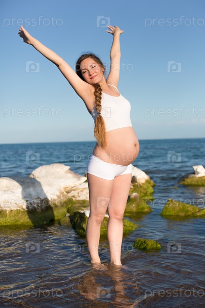 Беременная женщина в спортивном бюстгальтере делает упражнения из йоги на море