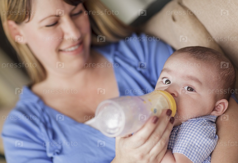 Счастливая мать кормит своего сына из бутылочки