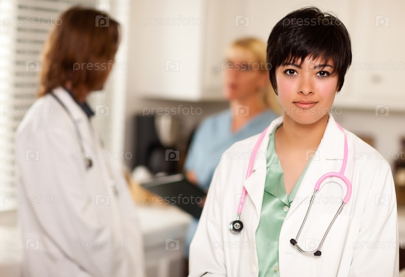 Привлекательная женщина-врач и беседующие коллеги