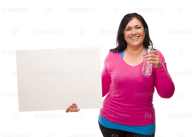 Латиноамериканская женщина в спортивном костюме с водой и чистым плакатом