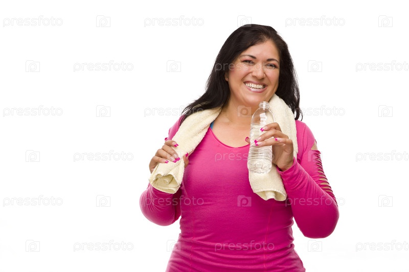 Латиноамериканская женщина в спортивном костюме с водой и полотенцем