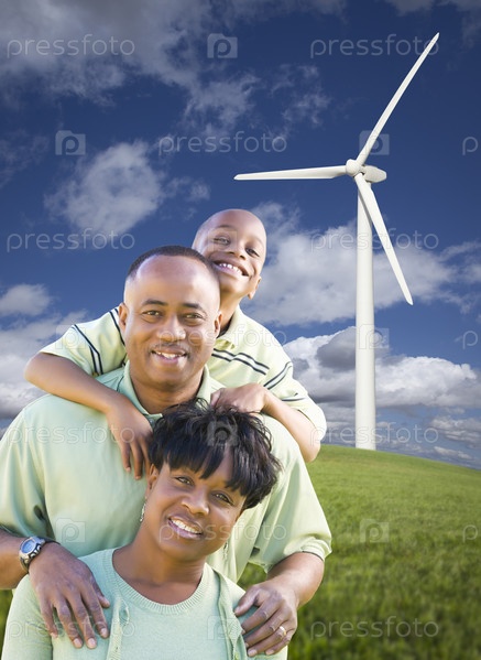 Счастливая афроамериканская семья и ветряные турбины