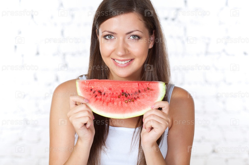Брюнетка ест арбуз