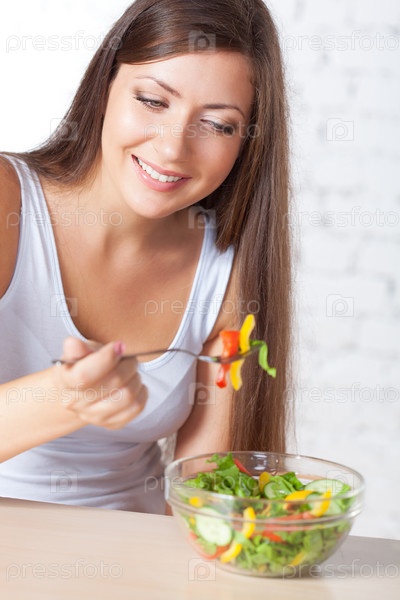 Красивая брюнетка ест салат