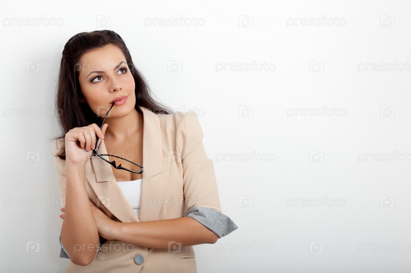 Деловая женщина с очками стоит у стены
