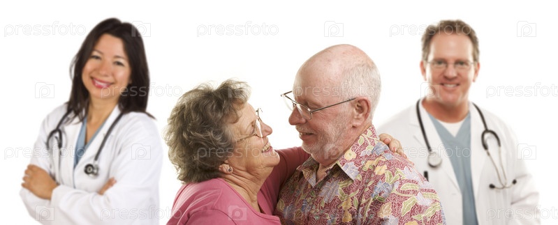 Пожилая пара и врач и медсестра на заднем плане