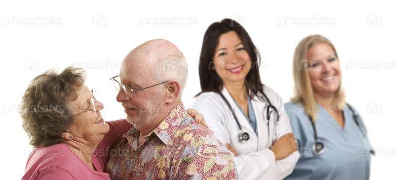 Пожилая пара и врачи и медсестры на заднем плане