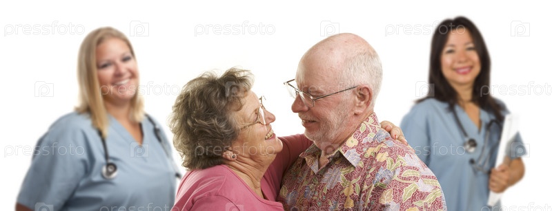 Пожилая пара и врачи и медсестры на заднем плане
