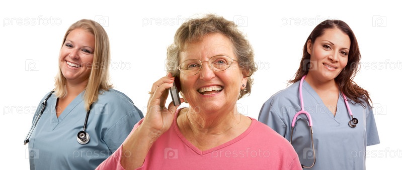 Пожилая женщина с мобильным телефоном и врачи на заднем плане