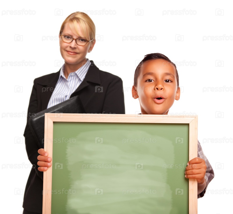 Латиноамериканский мальчик с меловой доской и учитель на заднем плане