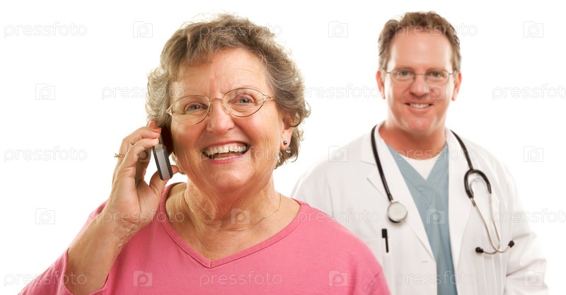 Пожилая женщина с мобильным телефоном и врач на заднем плане