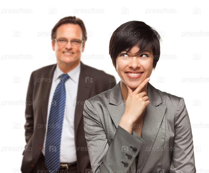 Привлекательная бизнес-леди и бизнесмен на белом фоне