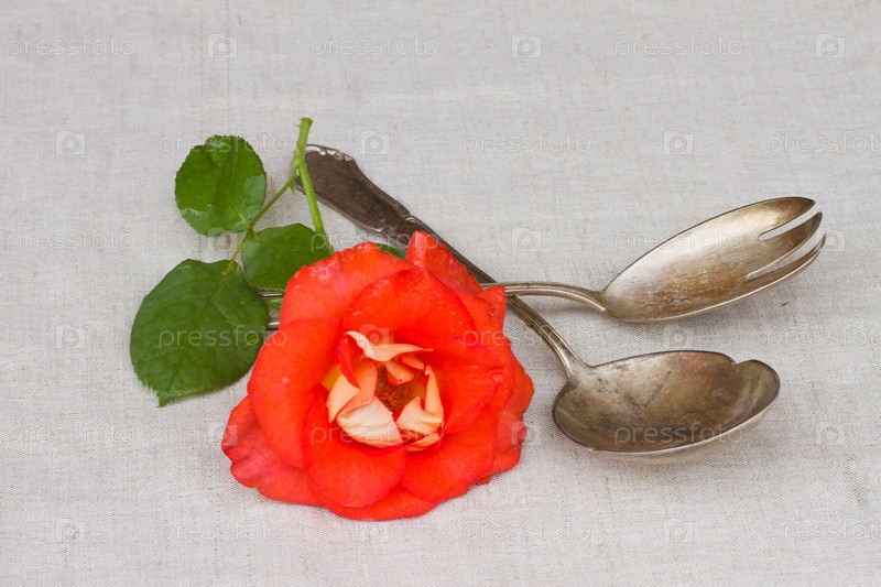 Старинные столовые приборы, ложка и вилка, и роза
