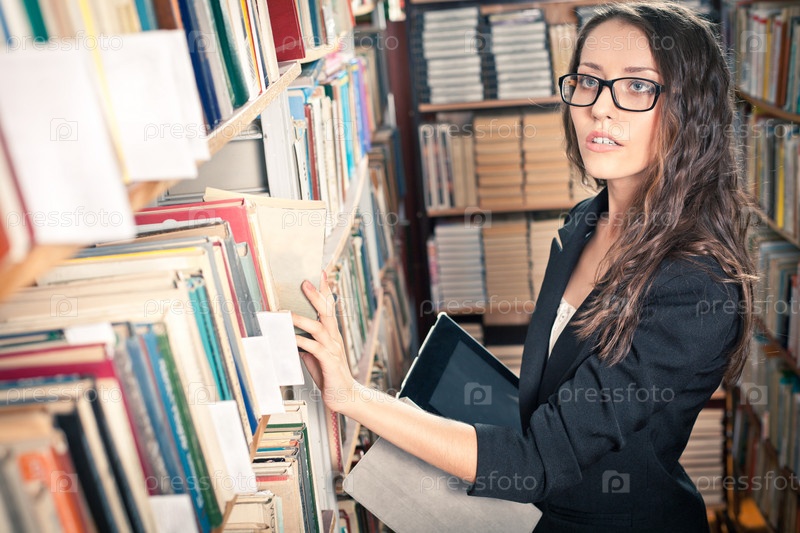 Брюнетка с планшетным компьютером в библиотеке