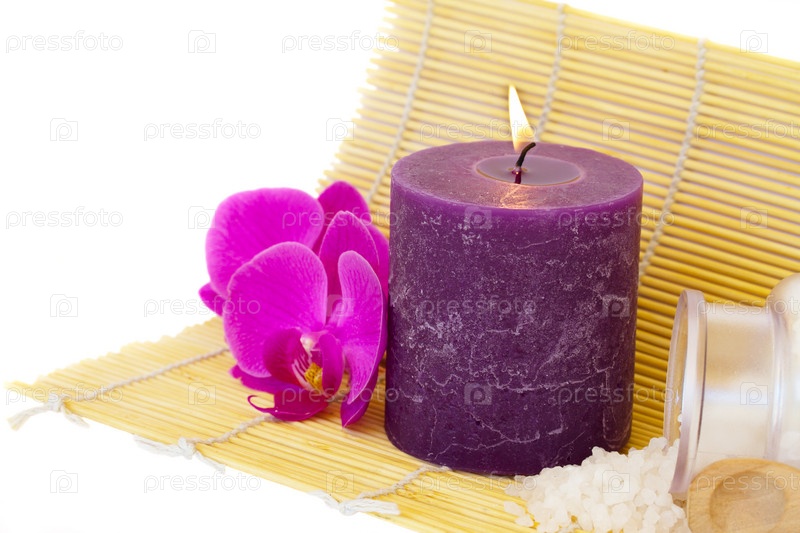 Свеча с морской солью и цветком на коврике