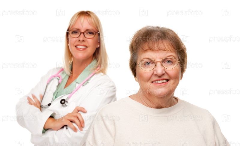Улыбающаяся пожилая женщина с врачом на заднем плане