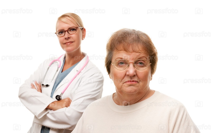Обеспокоенная пожилая женщина с врачом на заднем плане