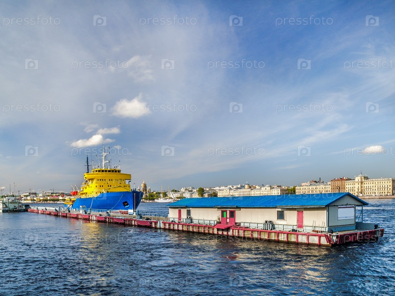 Пристань на реке Неве с ледоколом в городе Санкт-Петербурге