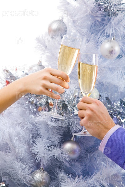 Близкий план флейты шампанского в человеческих руках на фоне украшенного фиртри