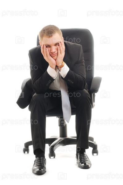 Унылый бизнесмен в кресле на белом фоне