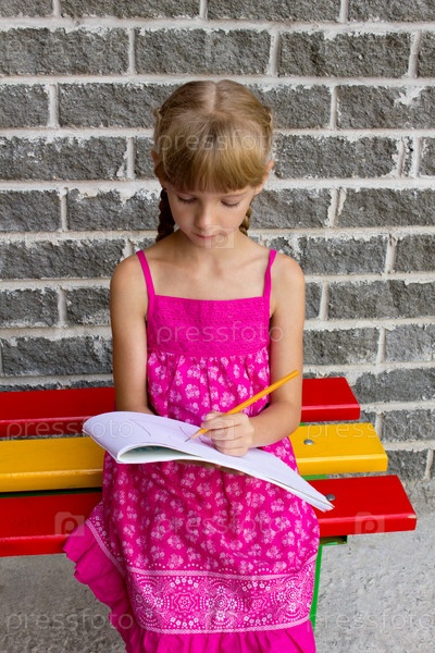 Девушка рисует в альбоме, сидя на скамейке
