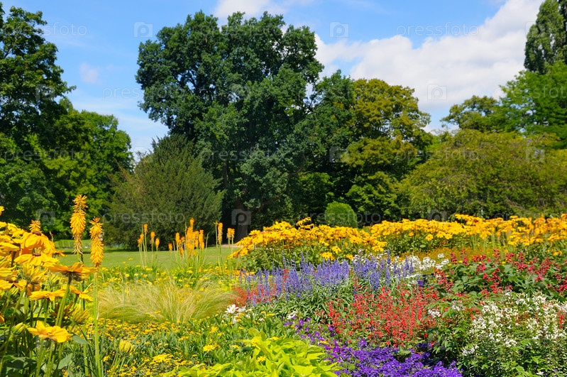 Летний парк с красивыми клумбами